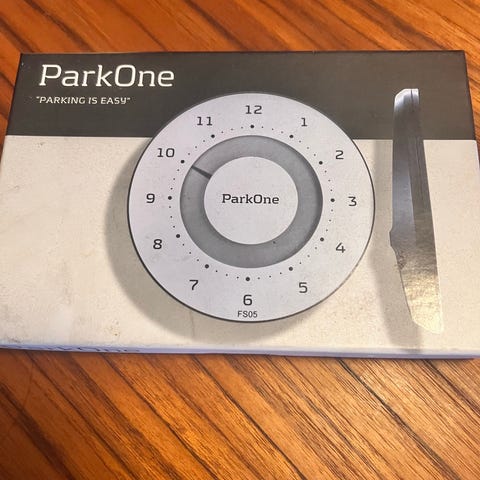 ParkOne F505 digital parkeringsskive i sort farve. Enheden har en rund form med en digital skærm og tre knapper til betjening. Designet til nem visning af parkeringstid og enkel håndtering. Materialet er plast, og produktet er velegnet til brug i biler til registrering af parkeringstid.