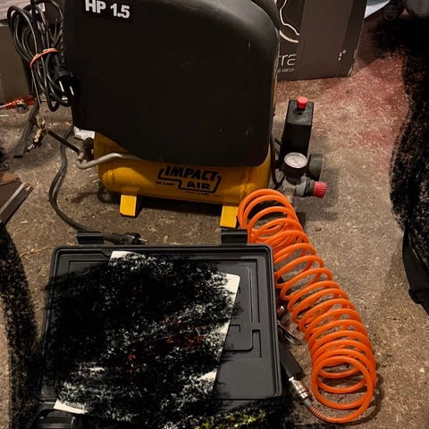 Airmaster Kompressor med en kapacitet på 24 liter. Sort farve og kompakt design med hjul for nem transport. Velegnet til forskellige luftværktøjer og oppustning.