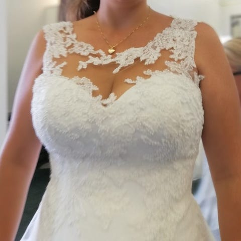 Fin brudekjole str 36/38, med slæb og snøreryg så omkredsen kan tilpasses. Tidligere bruger er 160 cm høj.
