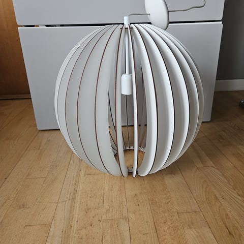 Mener at den er købt i ILVA. Den består af lameller der er hvide med træ på kanten, som giver et hyggeligt lys. Diamenter 30 cm, højde 30 cm, ledningen er ca. 70 cm lang.