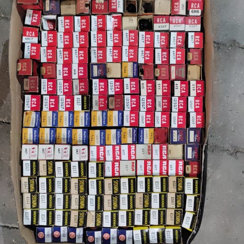 Kasse med ca 150 radiorør. Som vist samlet kun 750. Sælger gerne delt. Minimum 10 rør for 100 + eventuel forsendelse. Will ship inside Europe.