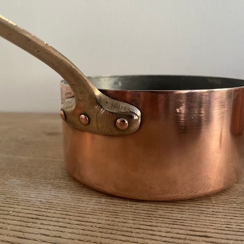 Villedieu kobber kasserolle, diameter 10 cm, højde 5 cm, håndtag 9 cm.