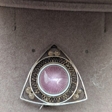 Smuk håndlavet emaljebroche med blomstermotiv i blå, grøn og hvid på sort baggrund.
