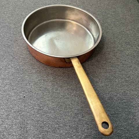 Meget flot oval fiskepande (gratin) mærket ‘Culinox Spring 77’ (Made in Switzerland). Mål: ca. 40 x 22 cm. Kobber, messing og rustfri stål. Har udelukkende været anvendt som pynt og aldrig brugt på komfur. Ganske små brugsspor fra ophæng og pudsning. Ikke til induktion. Sender gerne med GLS eller DAO. Køber betaler porto.