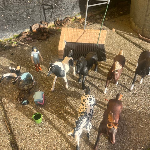 Schleich hestefigur sæt indeholdende flere hestefigurer i forskellige farver og racer, tilbehør som sadler, foder, og en fold i trædesign. Sættet er egnet til leg og samling, designet til børn med interesse for heste og dyreliv.