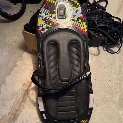Fuldt funktionelt O’Brien kneeboard sælges sammen med et tube (stor badering med håndtag osv. som kan trækkes efter en båd) og vandski-line. Knee-boardet har et hult design som gør det ekstra let, så det planer let efter selv små både. Det er brugt med diverse brugsspor, men alt er fuldt funktionsdygtigt. Prisen er for hele sættet ved afhentning i Bagsværd