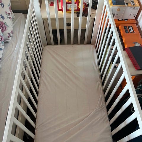 Troll Tremmeseng Lux i hvid træ. Tremmesengen har standard størrelse og er egnet til små børn. Den leveres med madras (har nogle plamager i den ene ende - se foto), hvis ønskes. Der kan også medfølge tre vådliggerlagner samt tre lagner (lagnerne er godt brugte og har måske et lille hul her og der). Stor og lækker sengerand fra Småfolk med ekstra betræk følger også med.
