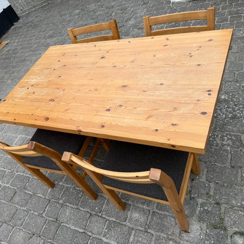 Træ spisebord med tilhørende 8 stole i naturfarvet træ. Bordet har et robust design med et mønster af træplanker på bordpladen. Stolene har flettede sæder og en enkel rygstøtte. Sættet er velegnet til spisestuebrug og kan rumme mindst otte personer. 2 tilleggsplader følger med.