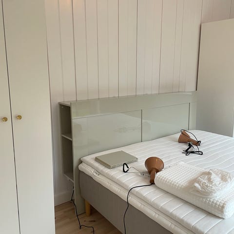 Farve: Hvid med en grøn bagside på den øverste hylde, på den ene gavl og bagsiden inde i den "hemmelig rum"