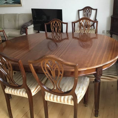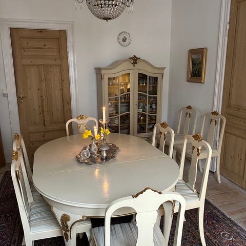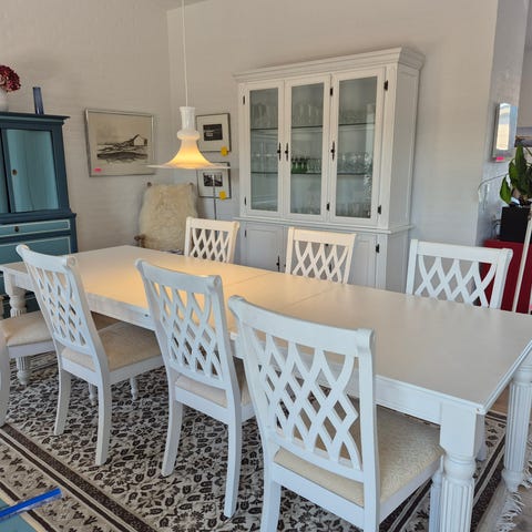Super flot spisestue. Spisestuen er helt nyrenoveret, og er malet i en flot grøn farve. Stolene har fletsæder.