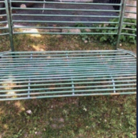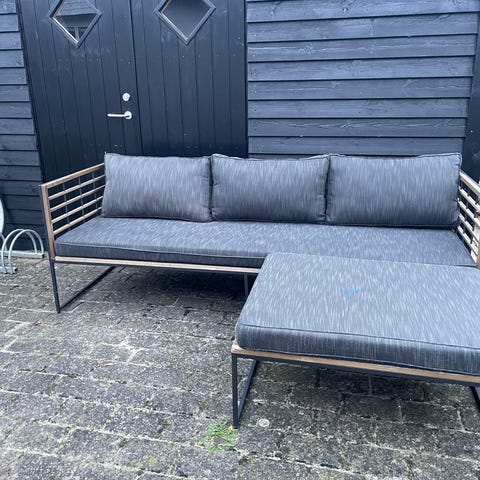 Sofa med beige betræk og polstrede puder. Har en stålramme som støtte. Passer til udendørs eller indendørs brug afhængigt af behov. Komfortabel til to personer.