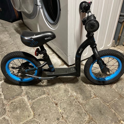Early Rider løbecykel med 12" hjul, sølvfarvet aluminiumsramme og brun sadel. Cyklen er designet til børn og har et let stel. Håndtag viser slidtage, men kan nemt skiftes. Ellers ingen brugsspor. cyklen er egnet til begyndere, der lærer balance og styring.