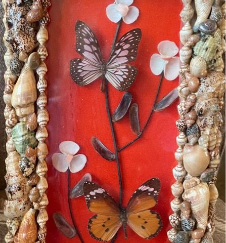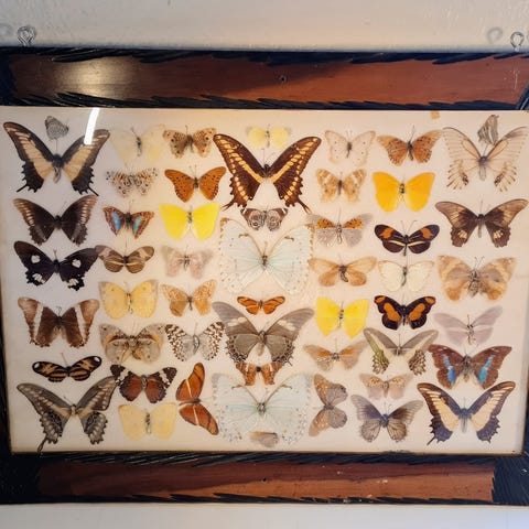 Gammelt fint vintage sommerfugle billede, 2 ægte sommerfugle i sortlakeret ramme, alm. aldersrelaterede brugsspor.