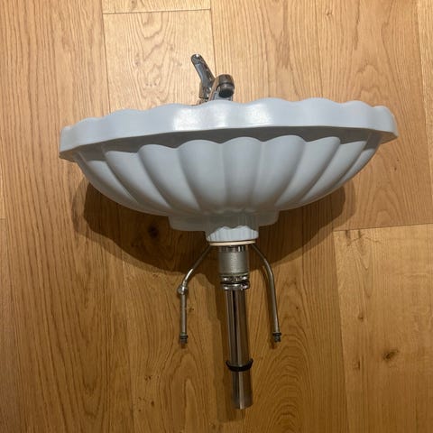 Ind mod en væg vil den fylde ca 32cm i bredden. På sit yderste altså mit på vasken måler den 47cm😊