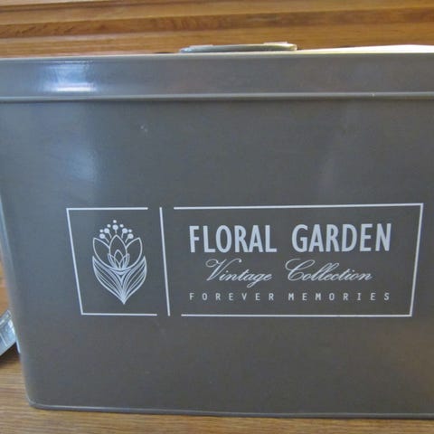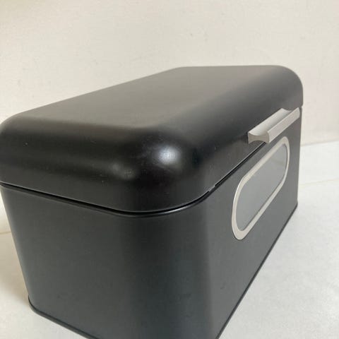 Blikkasse i metal med bærehåndtag og låse. Kassen er rektangulær med rundede hjørner og en glat overflade. Designet til opbevaring og transport af madvarer.