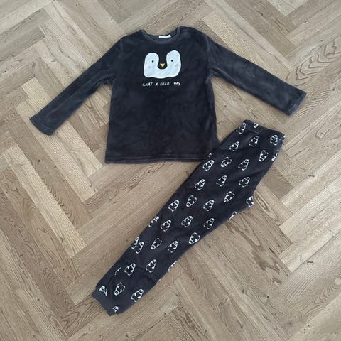 Mørkegråt blødt sæt i størrelse 8-9 år. Brugt og ret fnuldret (det blev det efter første vask på 30 grader). Dog stadig lækkert blødt.