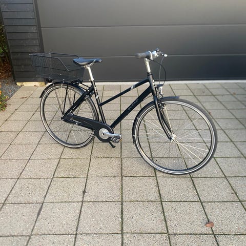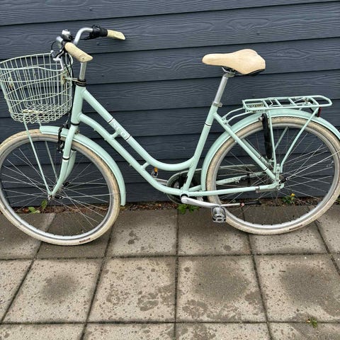 Cyklen har 7 indvendige gear fra Shimano, lukket krankboks med fast lejer, dobbeltbundede aluminiumsfælge med rustfri eger, fodbremse på baghjulet og V-bremse på forhjulet plus cykelkurv.