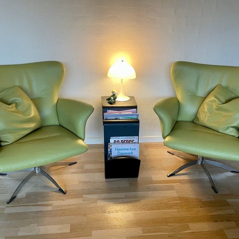 IKKE RYGER HJEM : 2 stk Hjort Knudsen Siena stol, skamler og nakkepuder.