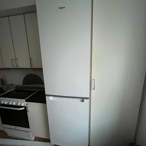 Whirlpool W7 køle-fryseskab i hvid farve med separate døre til køle- og fryserum. Indvendigt er der flere hylder og skuffer til opbevaring af madvarer. Skabet er designet til husholdningsbrug.