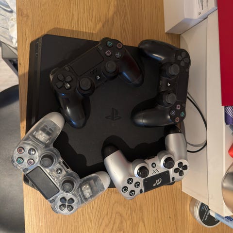 Sælger min brugte PS4 Slim (ca. 500 GB) inkl. 2 (brugte) controller og alle nødvendige kabler. Konsollen virker perfekt.