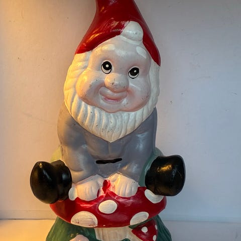 Flirtende havenisse med saks og fluesvamp. 25 cm SE FLERE