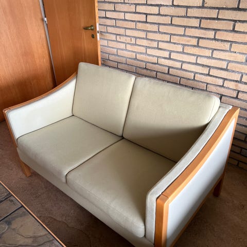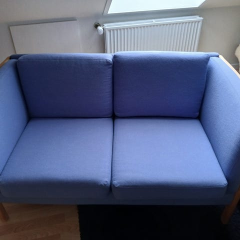 Sofa fra Stouby med plads til 2 personer. Sofaen har en ramme i bøgetræ og polstring i blåt uldstof. Designet med lige linjer og en åben ryg med trælameller.