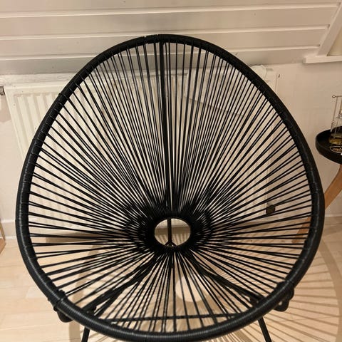 Acapulco Stol med rund sædeform i grøn plast og sort metalstel. Designet til indendørs og udendørs brug, med en karakteristisk stribet sæde lavet af plasttråde. Stolens stel er lavet af metal for stabilitet og holdbarhed.