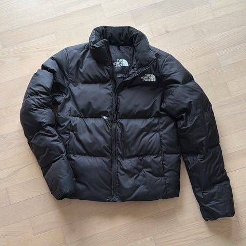 The North Face jakke til damer i størrelse S. Jakken er lilla med hvide og sorte detaljer. Den har hætte og er lavet af let materiale, egnet til udendørs brug.