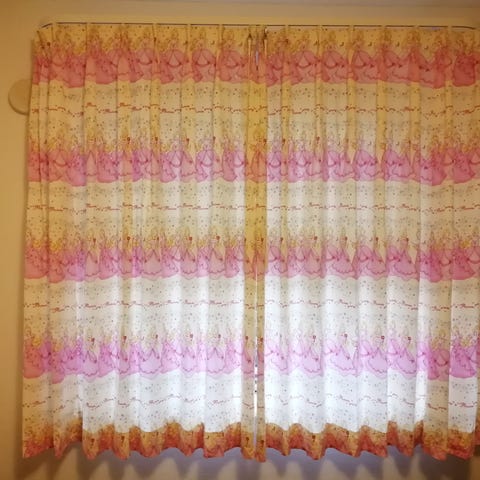 Lyserøde og lilla børnegardiner med rynkebånd og gardinkroge.