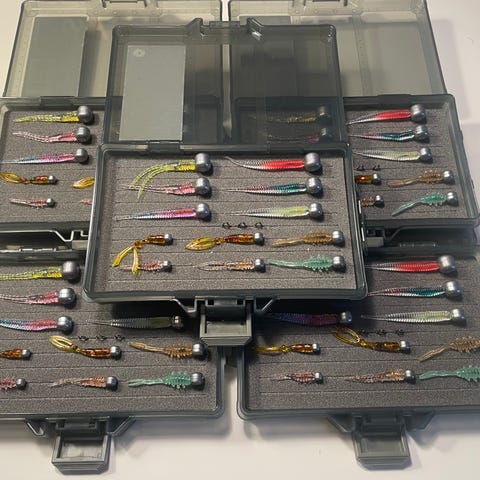 Sælger en stor pakke med hav-jigs, shads og jig-hoveder – blandet fra forskellige mærker.