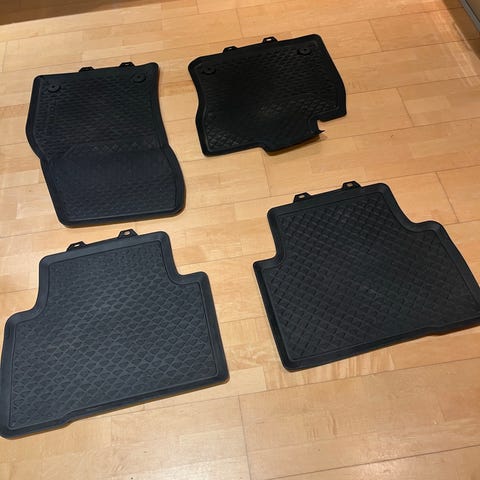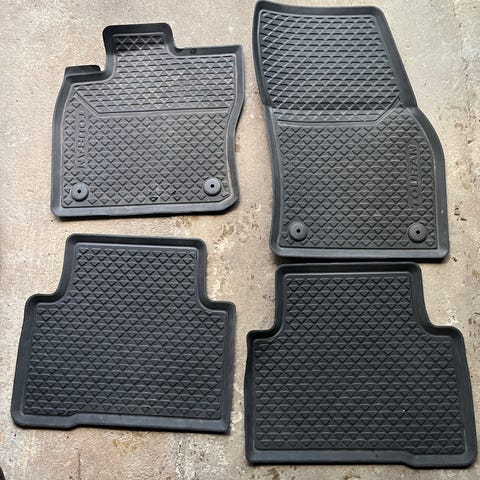 Volkswagen Touran gummimåtter sæt bestående af fire dele. Måtterne er sorte og designet til at beskytte bilens gulv mod snavs og fugt. Passer til specifikke Volkswagen-modeller og er lavet af holdbart gummimateriale.