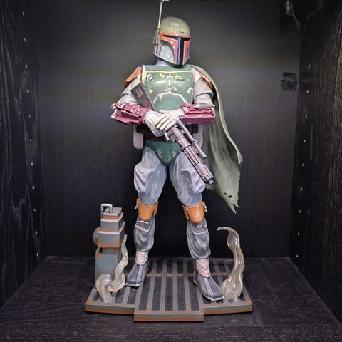 The armored Boba Fett figure features a meticulously crafted Mandalorian helmet and armor with distressed effects, his iconic jetpack with a detachable rocket and firing effect, weapon firing effects, a blaster, a chain code effect accessory, and a rocky diorama display stand!