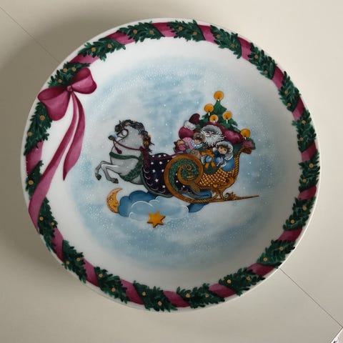 Royal Copenhagen Juleplatte tallerken med julemotiv og guldkant. Tallerkenen er fremstillet i porcelæn og har et klassisk design med juleblade langs kanten. Velegnet til brug ved juletid.