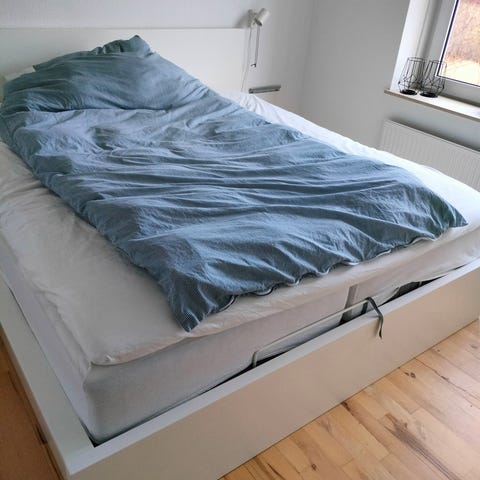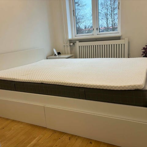 Malm med 4 skuffer i den mørkbejset udgave, 2 stk. Wellpur Gold F110 madrasser i 90•200 & 1 Wellpur topmadras i str. 10•180•200.