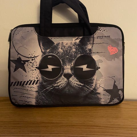Tablet Taske i beige og sort stof. Mål fremgår af billederne