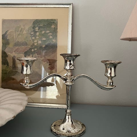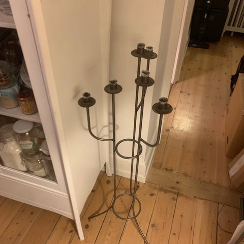 Dekorationslysestage fremstillet i metal med flere arme til lys. Lysestagen har en dekorativ og klassisk stil. Antik gulvlysestage.