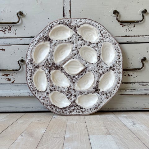 Flot østersfad der fremstår med den skønneste, håndmalede glasur i grå og hvide nuancer.