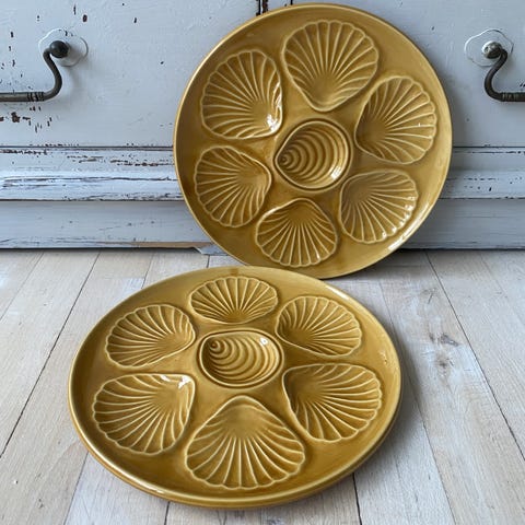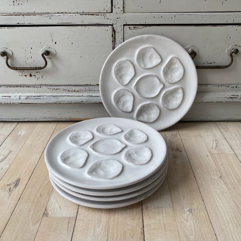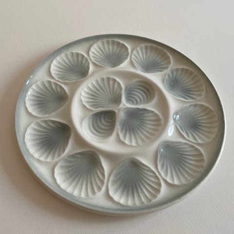 Fint opdelt fad til østers og skaldyr, der er fremstillet i smuk fransk håndmalet porcelæn med plads til et dusin (12 stk.) østers og citron i midten. fra porcelænshuset Moulin des Loups - France