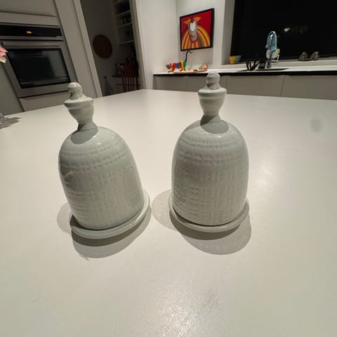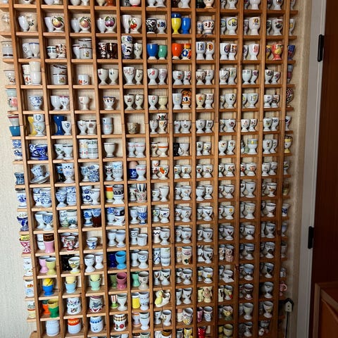 Arabia æggebæger i porcelæn med farvet mønster i blå, grøn og lilla nuancer. Designet til at holde et enkelt æg til servering. Har en solid fod for stabilitet.