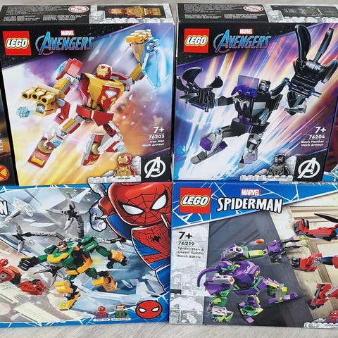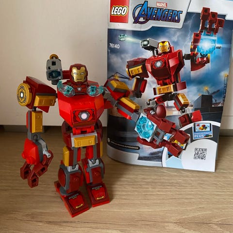 LEGO Marvel Iron Man Mech legetøj, modelnummer 76140. Passer til børn fra 6 år og op. Indeholder en Iron Man minifigur og en stor mech-robot i røde og gule farver. Materiale: plast.