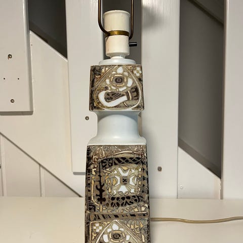Stor sandfarvet lampe. 82 cm høj og 22 cm bred.