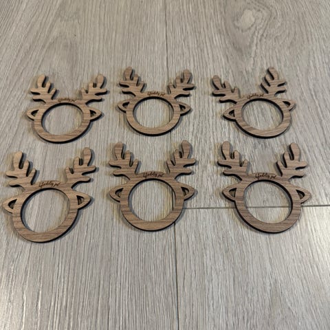 Julepynt servietringe formet som rensdyr i guld. Designet til at dekorere servietter til julebordet. Materiale og størrelse er ikke specificeret, men produktet består af flere rensdyrservietringe til brug ved borddækning i juletiden.
