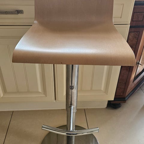 Beautifully crafted CB2 bar stools featuring solid wood tripod bases and black metal footrest rings. The round wooden seats swivel smoothly, combining function with modern industrial style. Ideal for a kitchen island, bar area, or high dining table.