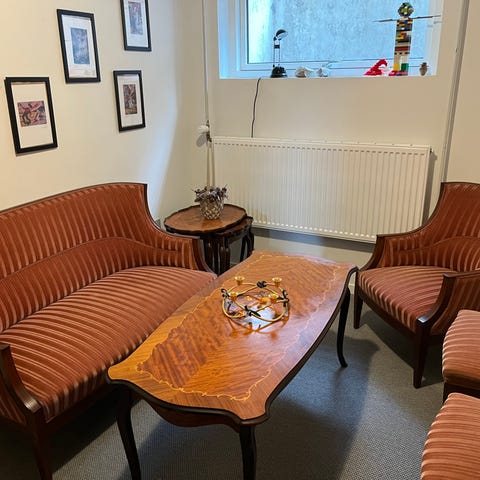 Sofagruppe med intakt fransk flet, en sofa og to stole. Der er en mindre revne på stoffet i bunden af den ene stol.