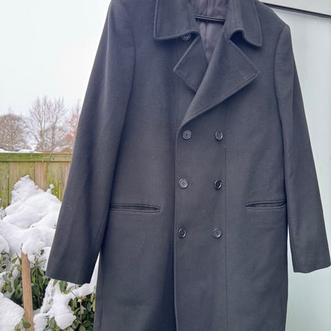SAND Copenhagen Frakke til herre i størrelse 50. Frakken er grå og har en foret inderside med mønster. Materialet består af kashmiruld og andre tekstiler, hvilket giver varme og komfort. Designet er klassisk med knapper foran og lommer. Velegnet til formelle og hverdagsbrug i køligt vejr.