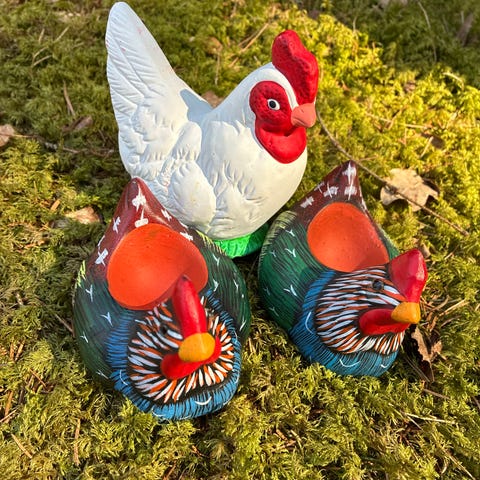 NYT sæt med tre skønne høns siddende i forskellige positioner på hvert sit æg.
