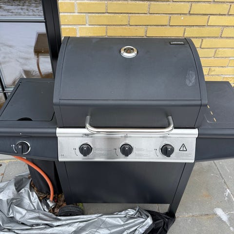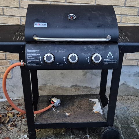 Med 3 brændere samt sidebrænder/kogeblus i højre side . Aflægger plade samt bund i venstre side til gasflaske . Trænger til en pudseklud samt lidt rengøring da den har stået ubrugt inde i et rum i nogle år . kraftig og velfungerende gasgrill sælges til " vinterpris " pga af flytning .