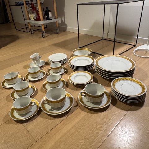 Komplet sæt af 12 stk antikke potage/bouillonskåle fra Royal Copenhagen. Velholdte og ingen tegn på slid, guldet er intakt.