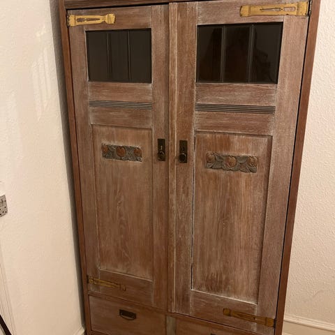 Ældre, fint patineret, træskab med to låger øverst og åbent rum med hylde(r) under. Skabet er lavet af bøgetræ og har en lakeret finish. Der medfølger en hylde mere.