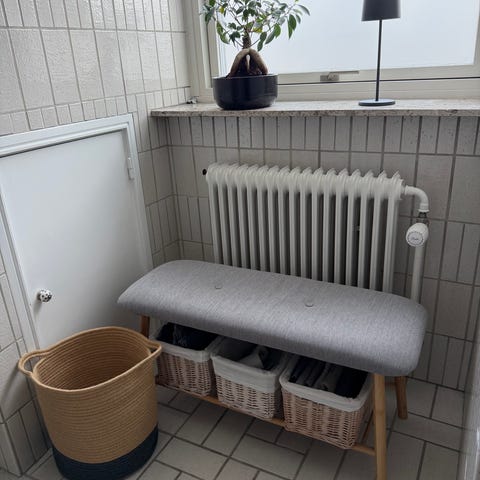 Stand: brugt på altanen på bænk og har brugsspor derfra, primært er stoffet blevet bleget af solen. Jeg havde planer om at jeg ville sy et nyt stof på den.